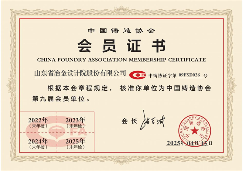 經(jīng)過前期準(zhǔn)備工作及入會(huì)申請(qǐng),4月15日中國鑄造協(xié)會(huì)核準(zhǔn)山冶設(shè)計(jì)成為協(xié)會(huì)會(huì)員單位(會(huì)員編號(hào)09FSD026)。